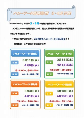 ハローワーク適職診断日程 *拡大参照 クリック⇒適職診断 3・4月スケジュール