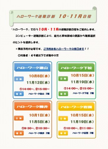 ハローワーク適職診断日程 *拡大参照 クリック⇒1011月適職診断